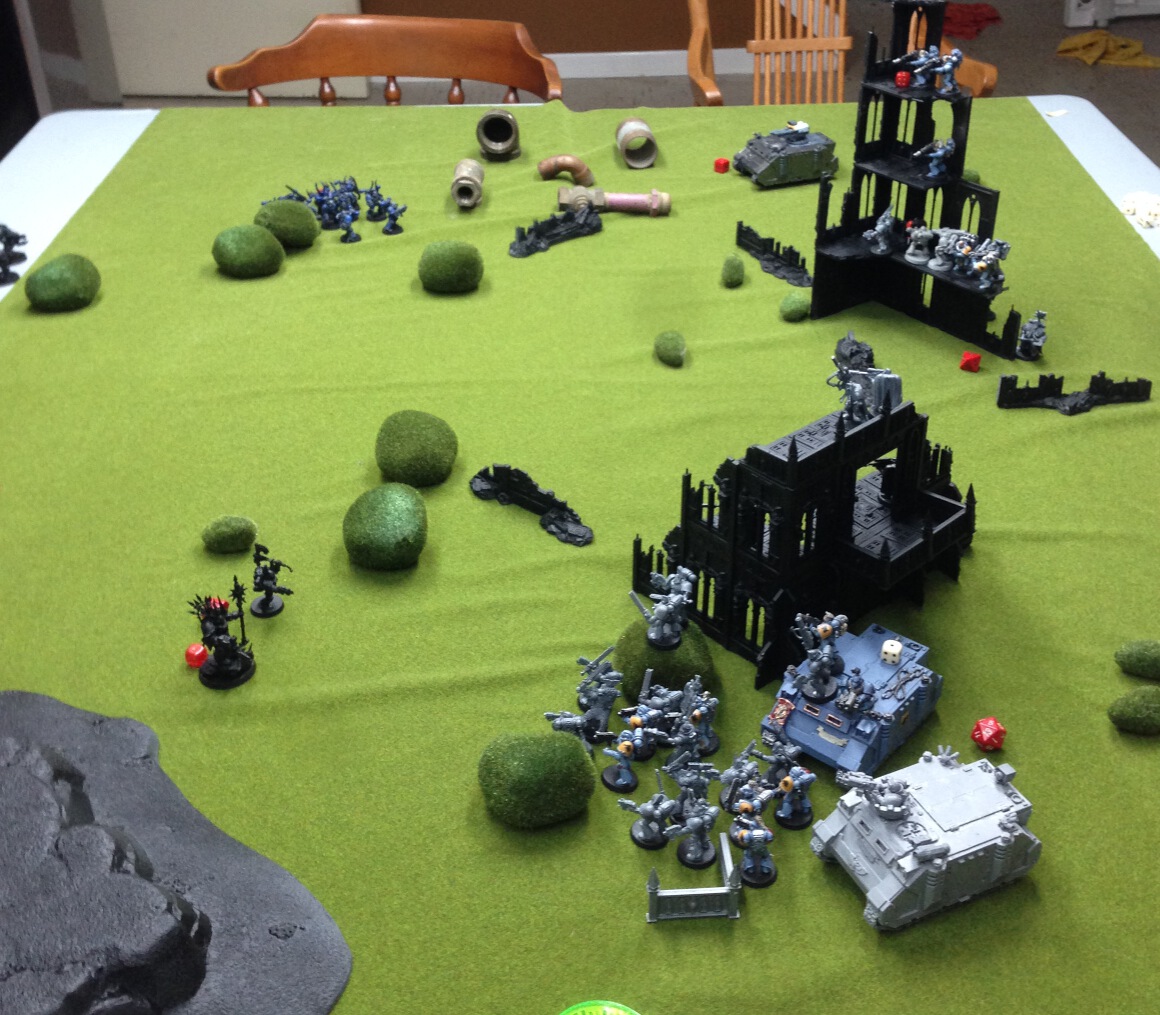 The remaining CSMs fall back to hold a nearby objective and take cover. The lord advances but is not close enough to anybody to charge.