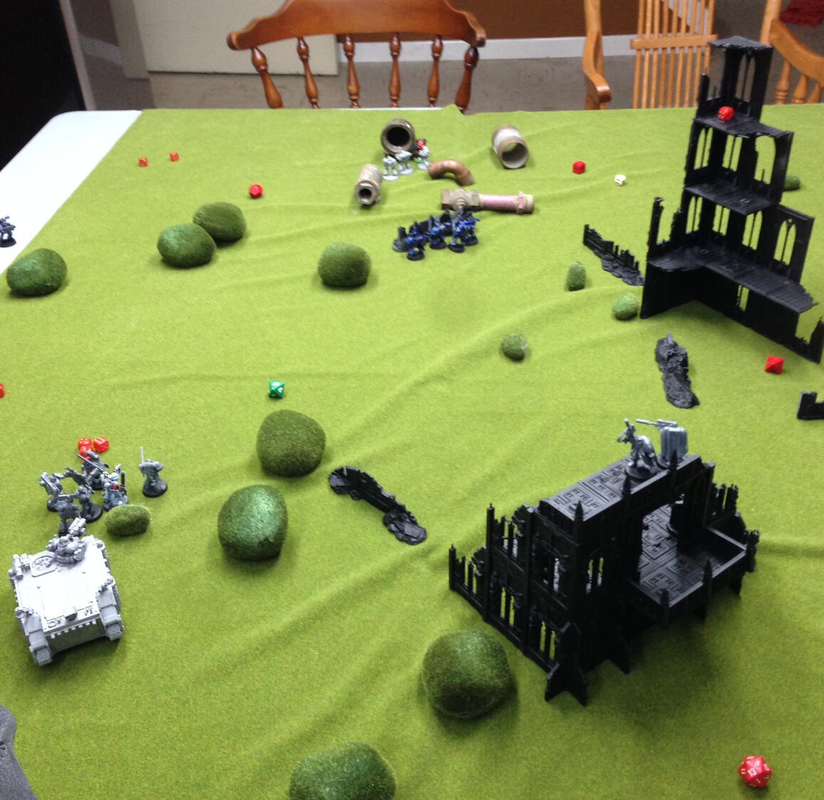 Parricidius moves onto an objective. fire support takes one wound off the lord. GHs deploy out of the rhino and attack the remaining CSMs, killing one. [I don't think my razorback is supposed to be able to climb hills like this.]